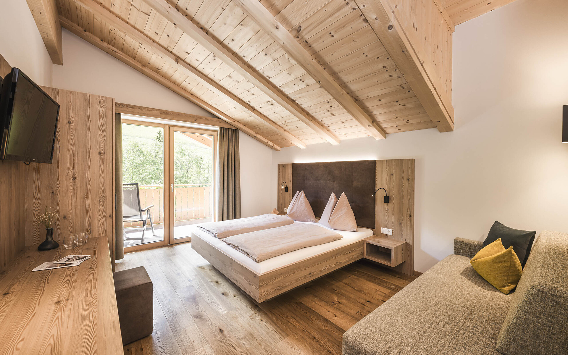 Doppelzimmer, Doppelbett, Zustellbett, Balkon, Allergikerzimmer, Safe, Nichtraucherzimmer, Dusche / Bad, Bidet, Haarfön, TV, Satellit/Kabel, WLAN, Haupthaus, Panoramablick, Südseite