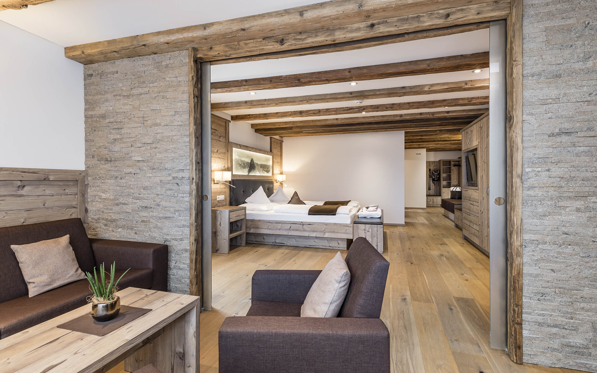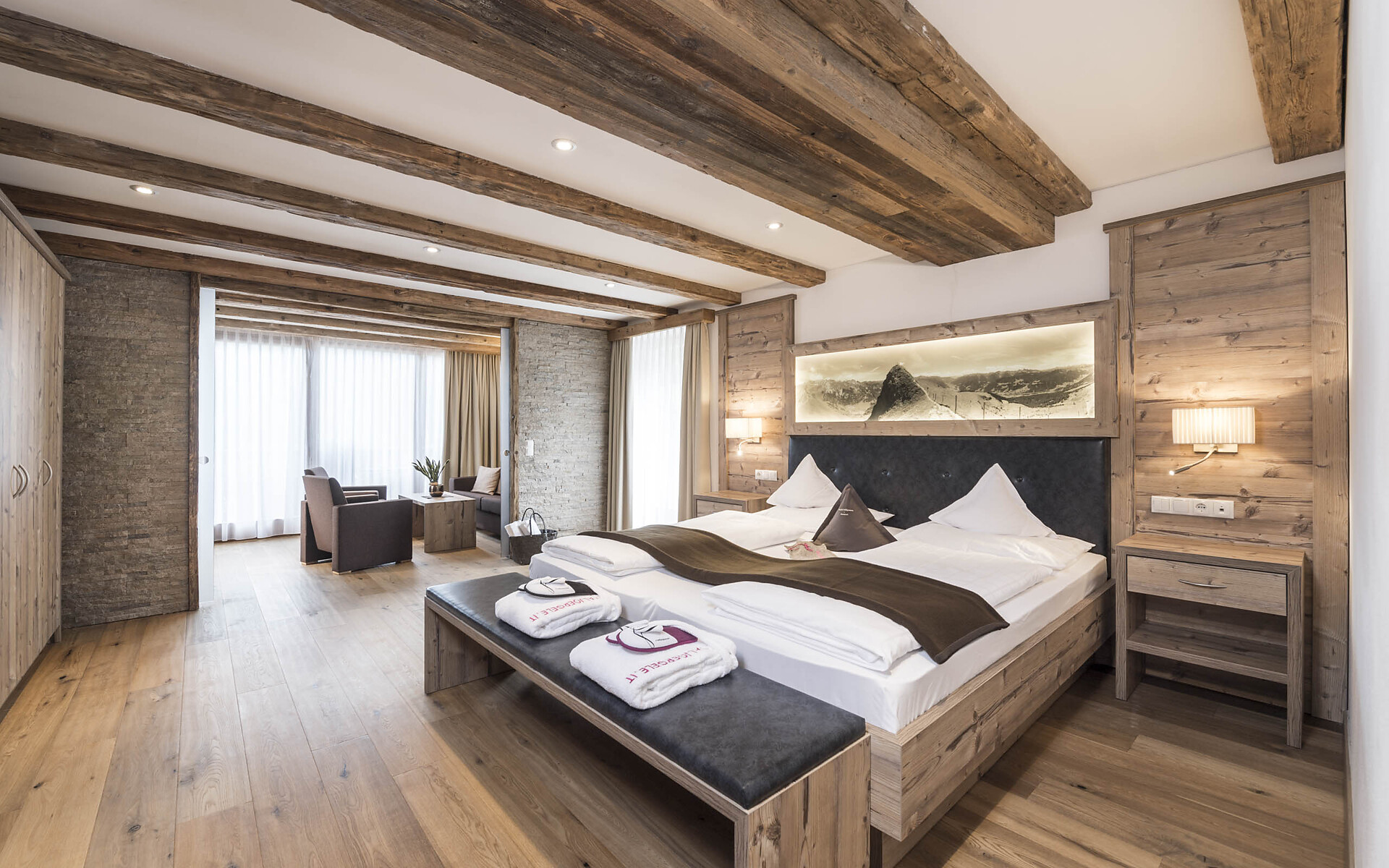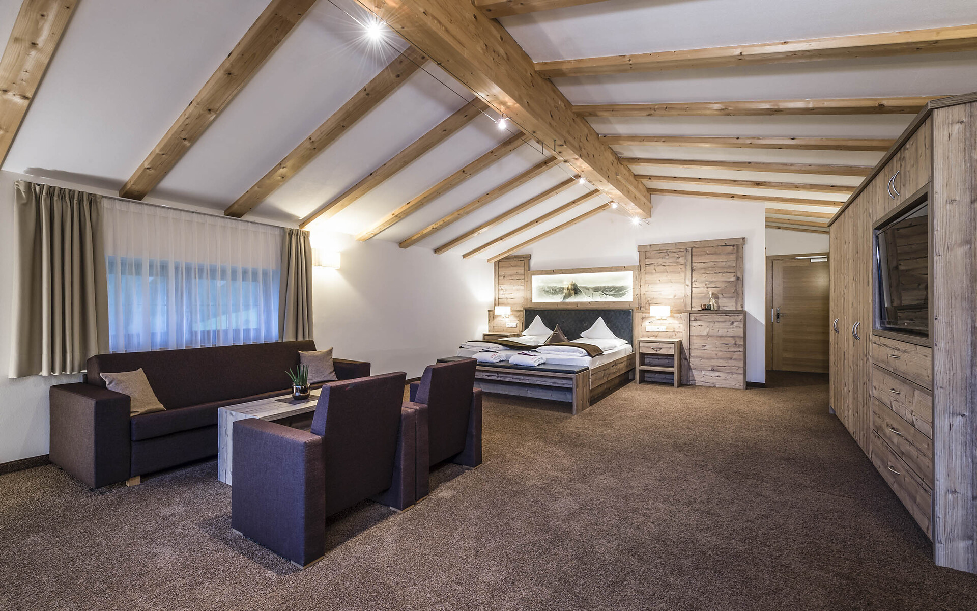 ca. 65 m²+15m² Loggia - 1 Wohnraum und 1 Schlafraum mit Schiebetür, oder der Wohnraum wird zum Schlafraum, Sitzecke, Couch, Bauernofen, Fitnesswand, 2 Fernseher, Safe, Minibar, Whirlwanne, Dusche, WC extra, Kosmetikspiegel, Fön, Telefon, Panoramaterrasse mit Blick ins Tal.