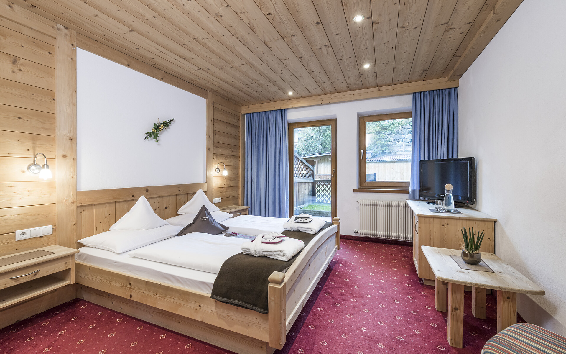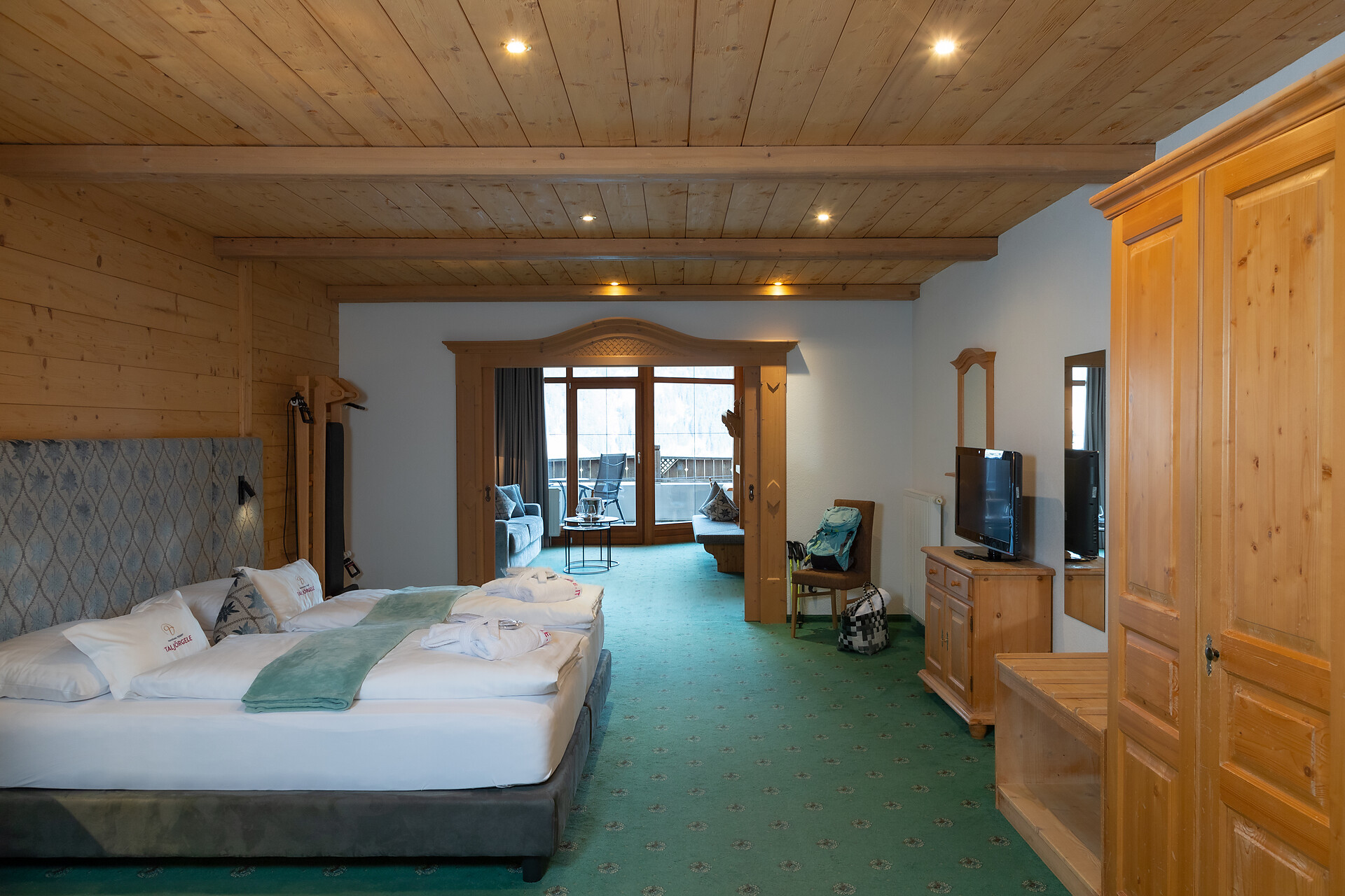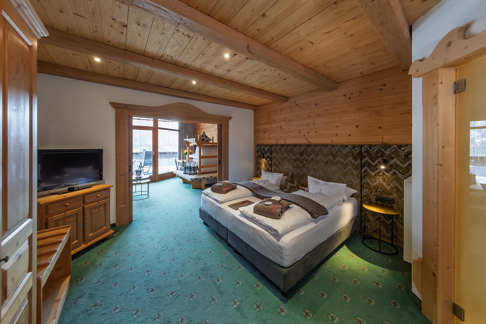 ca. 65 m²+15m² Loggia - 1 Wohnraum und 1 Schlafraum mit Schiebetür, oder der Wohnraum wird zum Schlafraum, Sitzecke, Couch, Bauernofen, Fitnesswand, 2 Fernseher, Safe, Minibar, Whirlwanne, Dusche, WC extra, Kosmetikspiegel, Fön, Telefon, Panoramaterrasse mit Blick ins Tal.