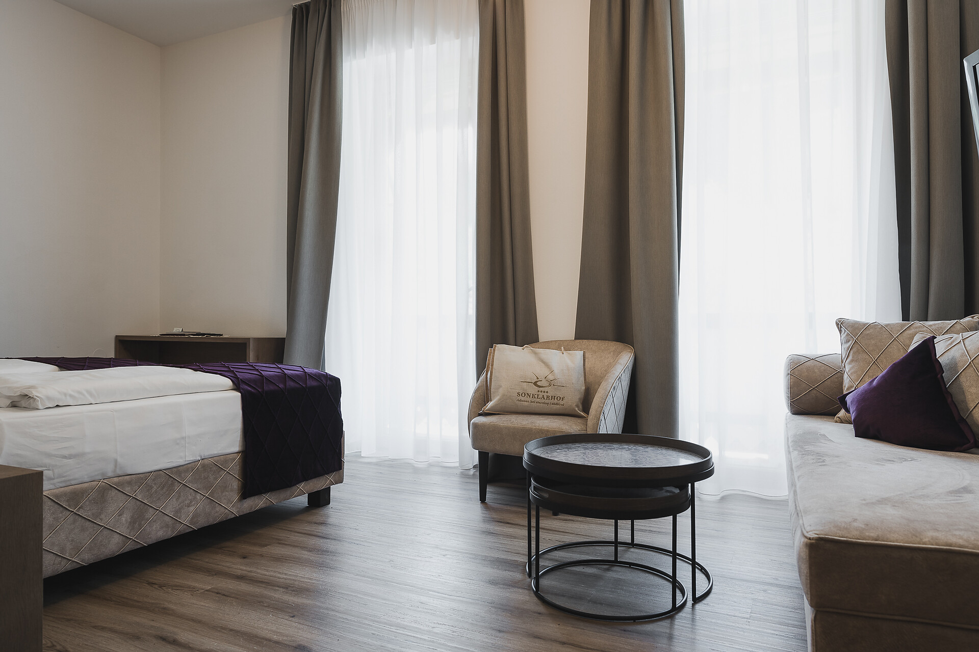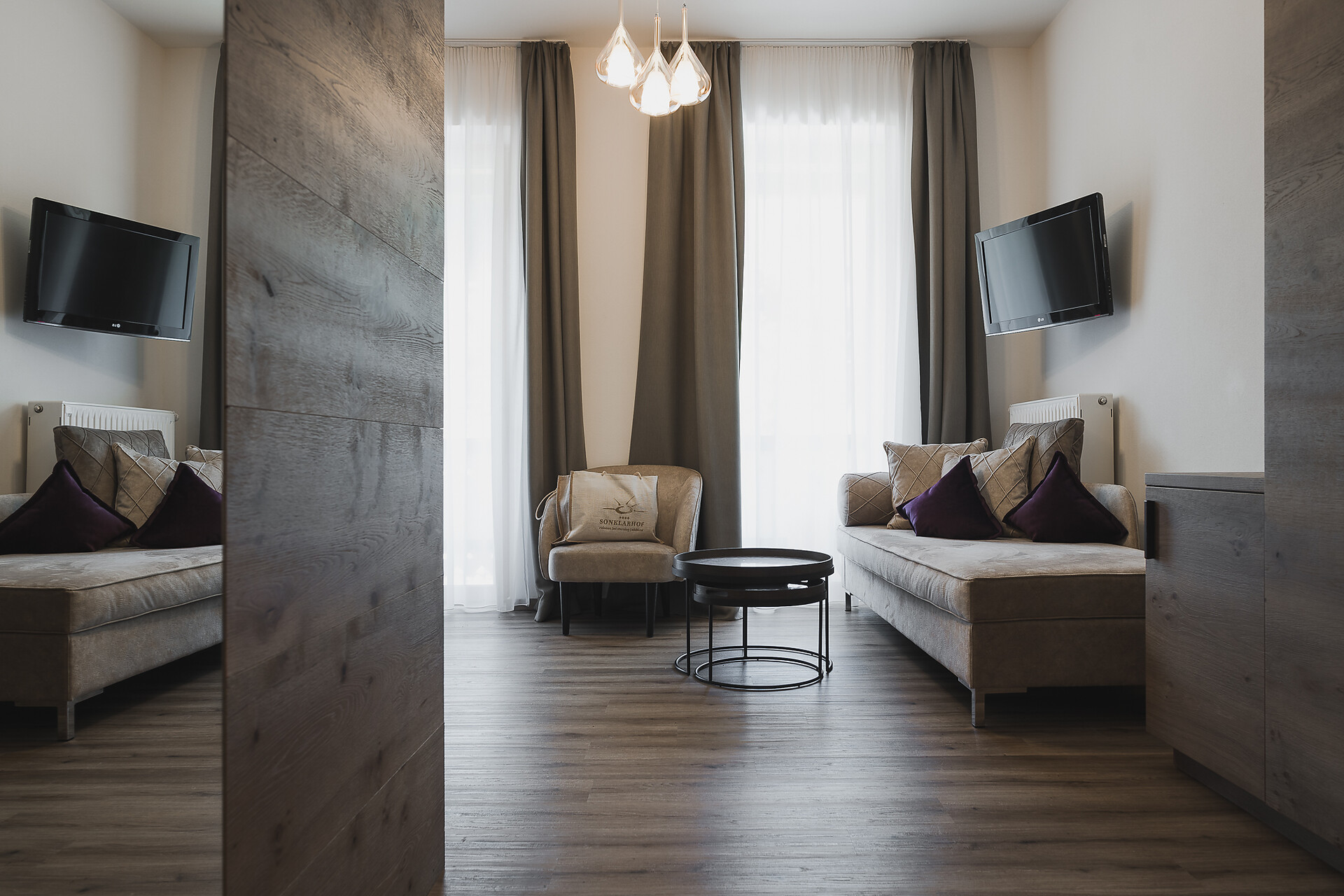 approx. 39 m², for 2-4 persons Only a five-minute walk from the hotel Bathtub or shower, toilet, bidet, hair dryer, TV with radio, telephone, safe, mini-bar, separate lounge area, free Internet access (Wi-Fi), balcony or terrace. Every apartment has a carport parking space available for use.