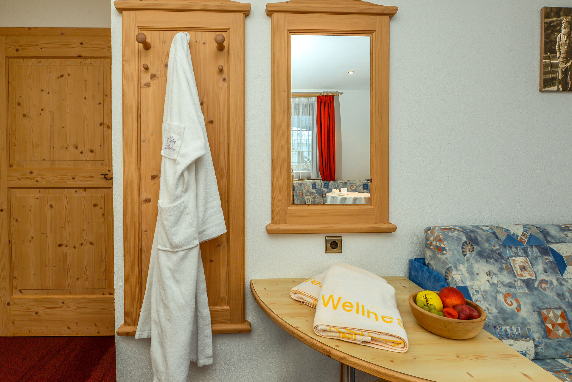 two separate bedrooms and a bathroom with large shower, toilet, bidet and hairdryer. In addition, the room disposes of 2 flat screen TV(43"), free Wlan, safe, desk and a couch which can be converted to one or two additional beds. A spa bag with cosy towels for sauna and pool is provided in the room.