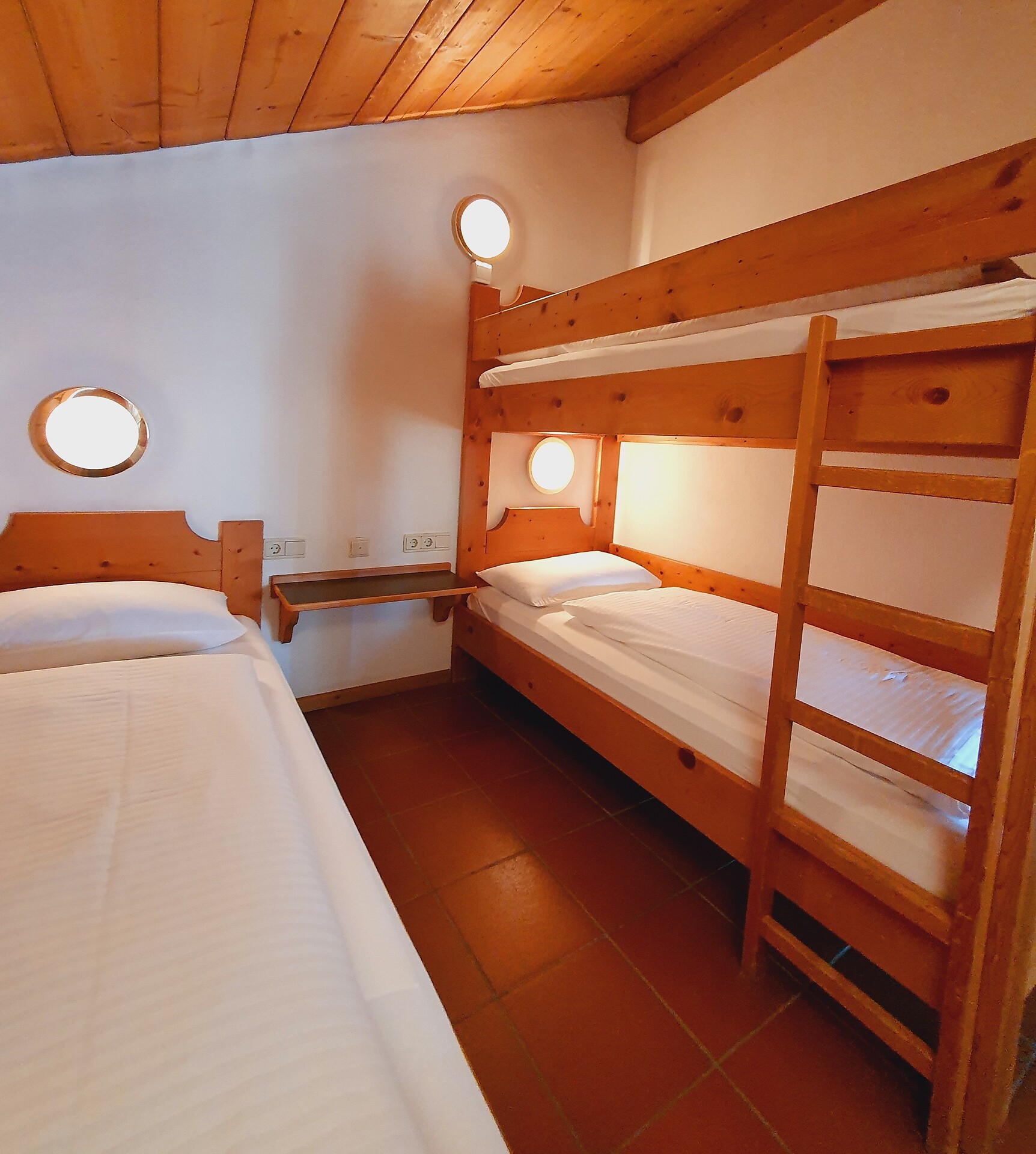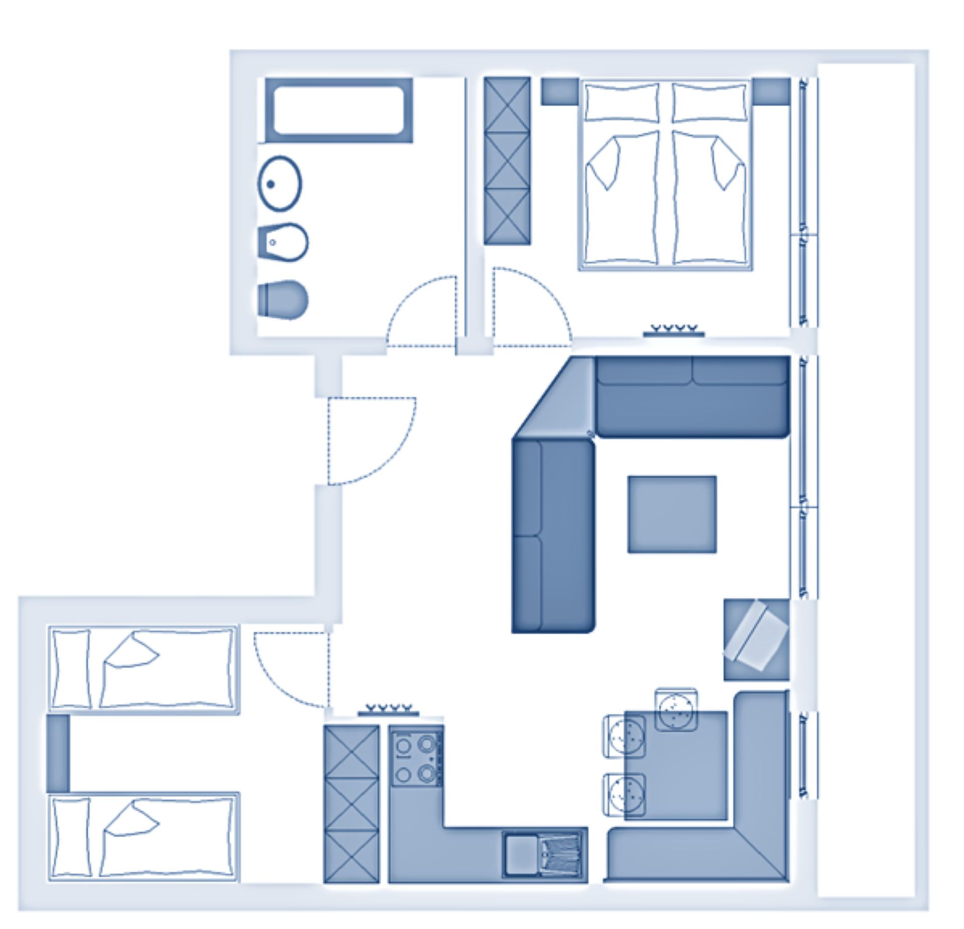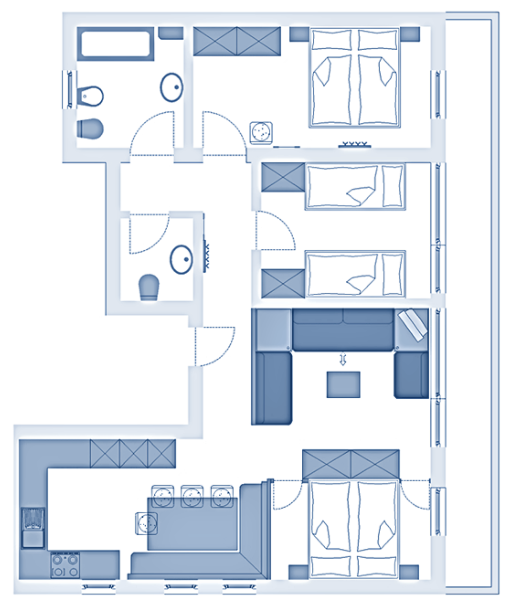 Ideal for 5-7 persons: three-room apartment with balcony, 1 double room, 1 further room for 3 persons with 1 single bed and a bunk bed, pull-out sofa bed for max. 2 persons in the living room; living area with TV, cosy dining area, kitchenette with dishwasher, oven, coffee machine, kettle and toaster; bathroom with bath and bidet. Towels and bed linen are included in the room price;