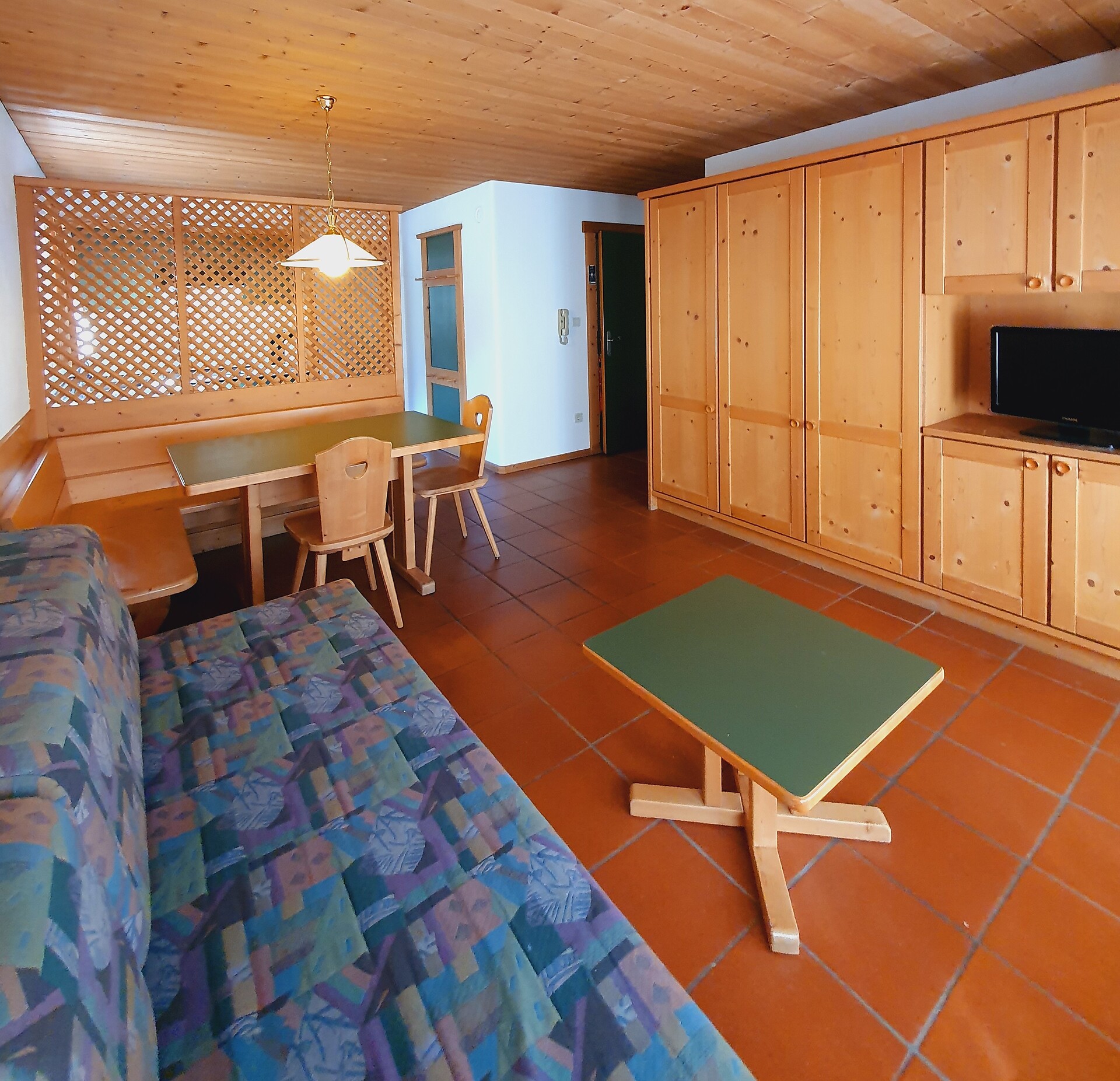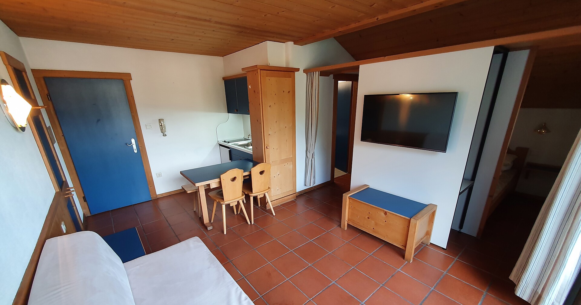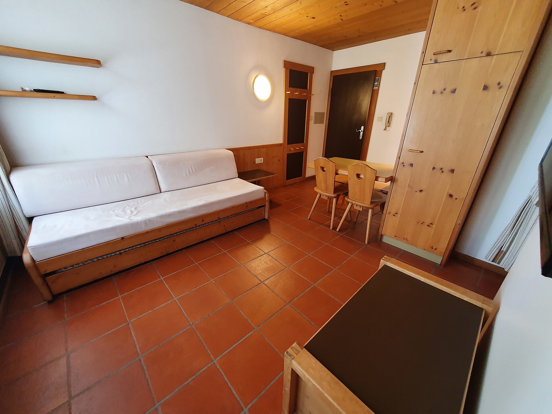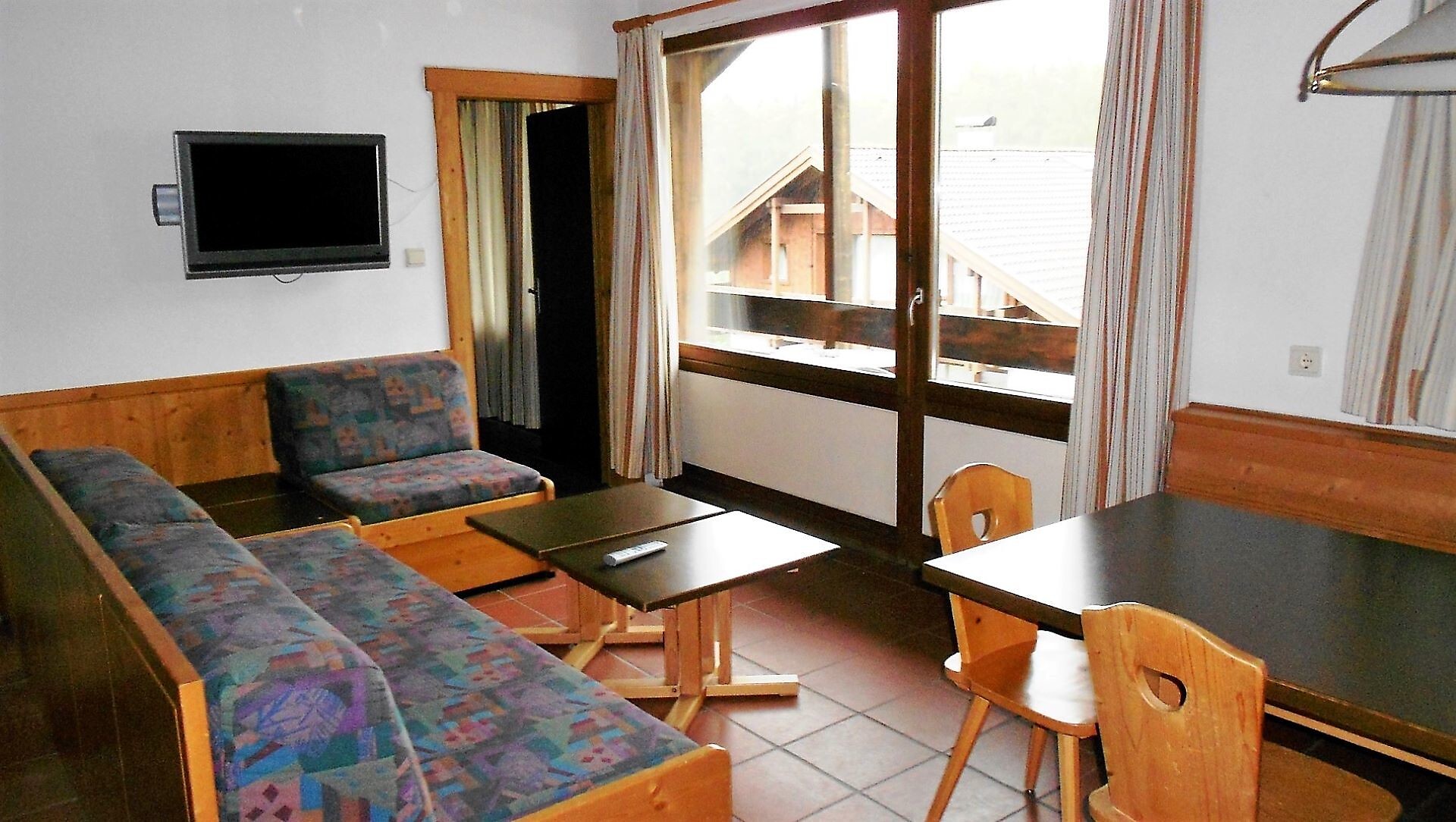 ideal for 3 adults: 2- room-apartment with balcony, 1 bedroom with double bed, pull-out sofa bed, TV and dining table in the living area, kitchenette; bathroom with bathtub and bidet. Towels and bed linen are included in the room rate; The flat is located on the first floor and is only accessible via the internal staircase.