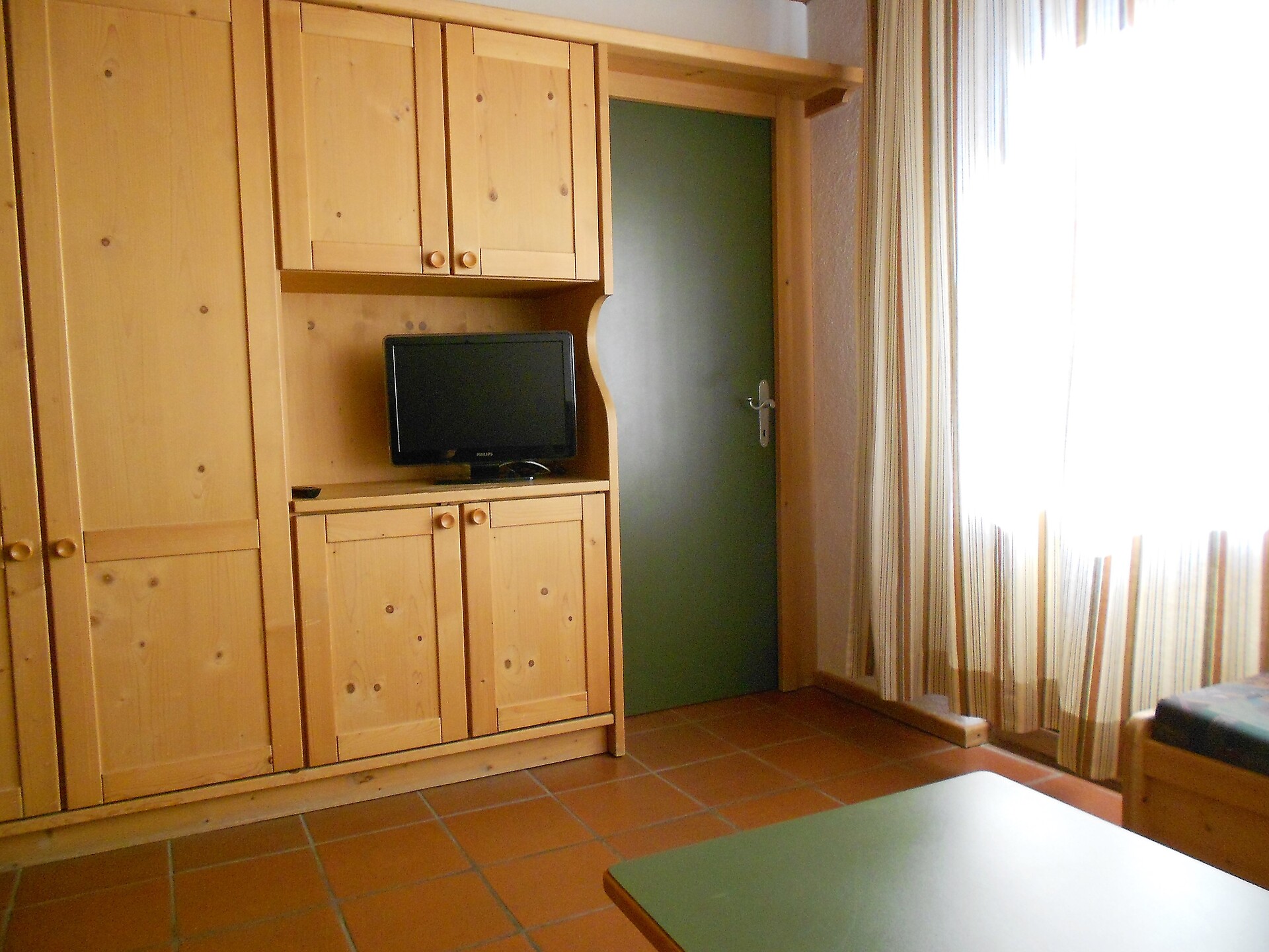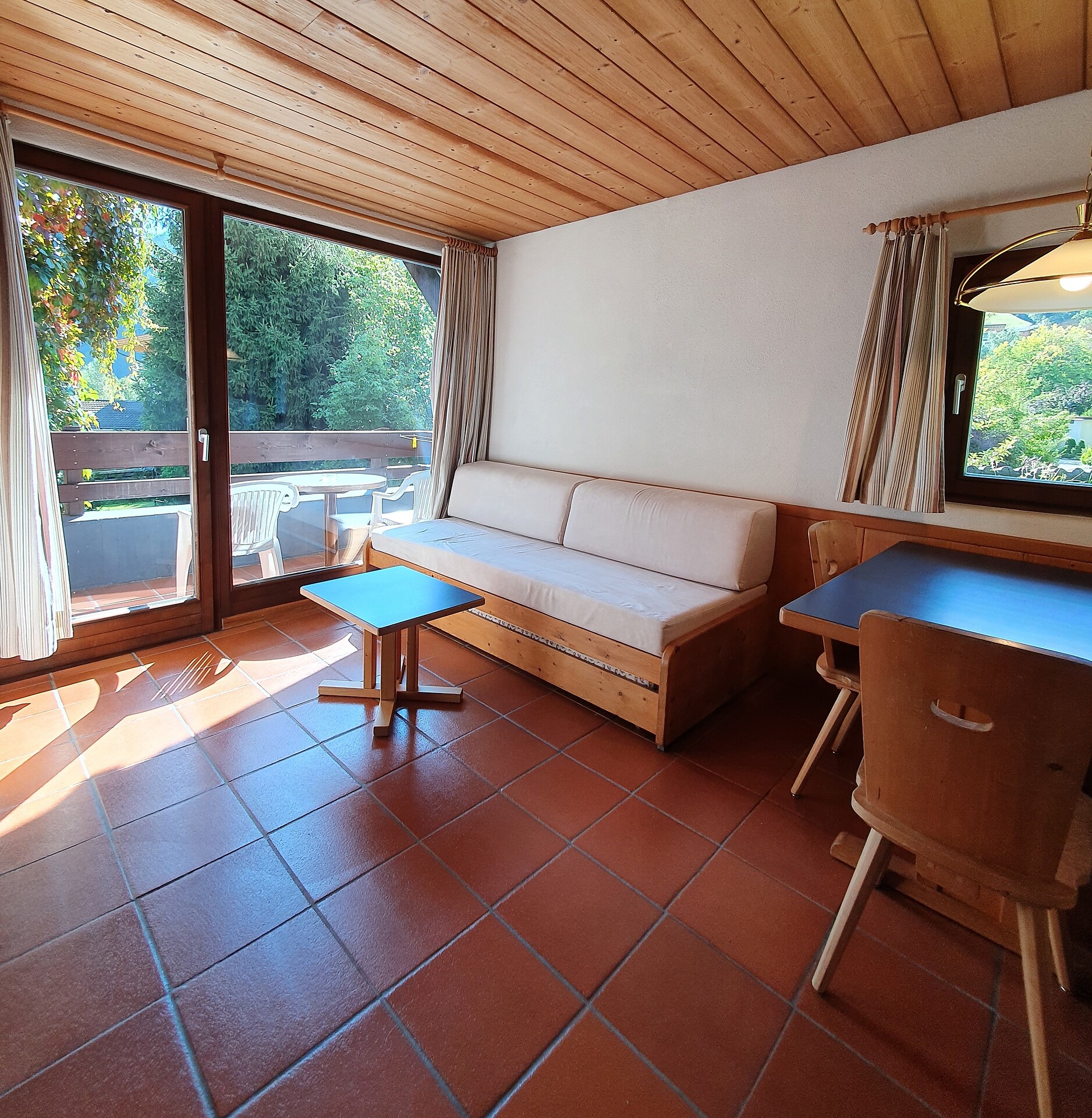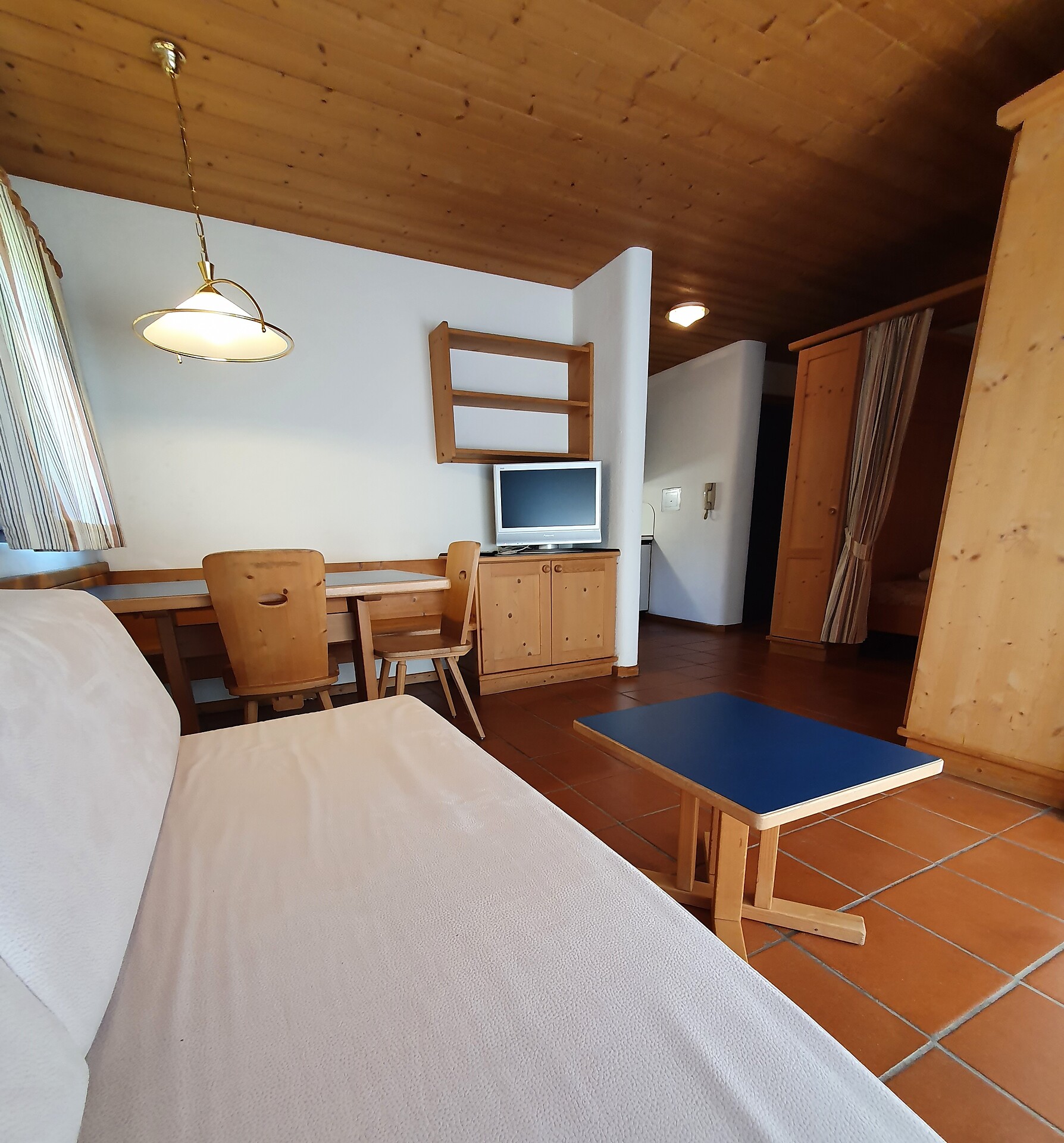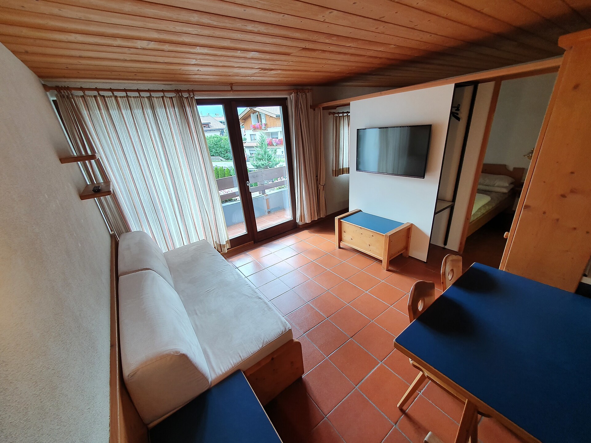 ideal for 3 adults: 2- room-apartment with balcony, 1 bedroom with double bed, pull-out sofa bed, TV and dining table in the living area, kitchenette; bathroom with bathtub and bidet. Towels and bed linen are included in the room rate; The flat is located on the first floor and is only accessible via the internal staircase.