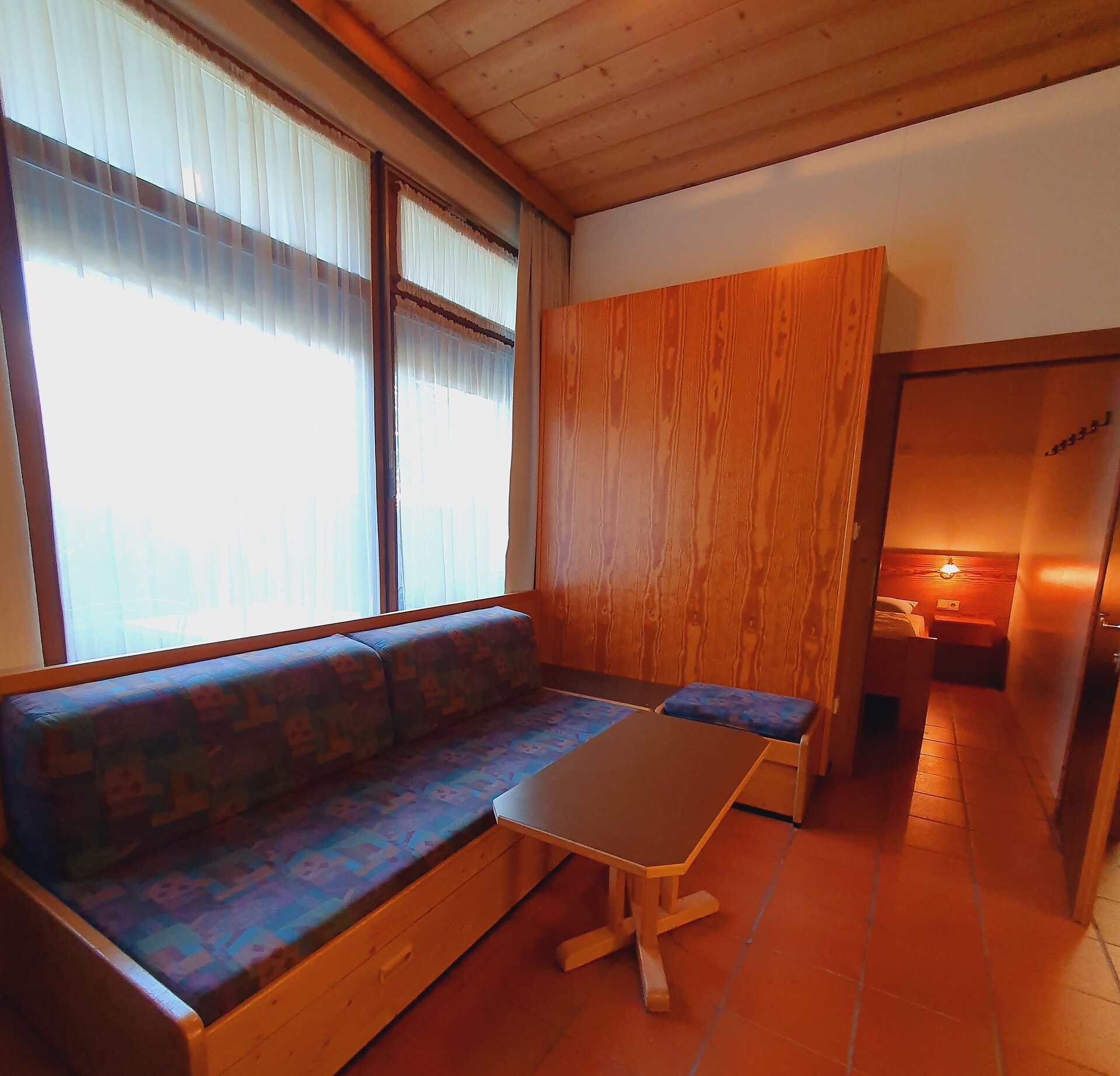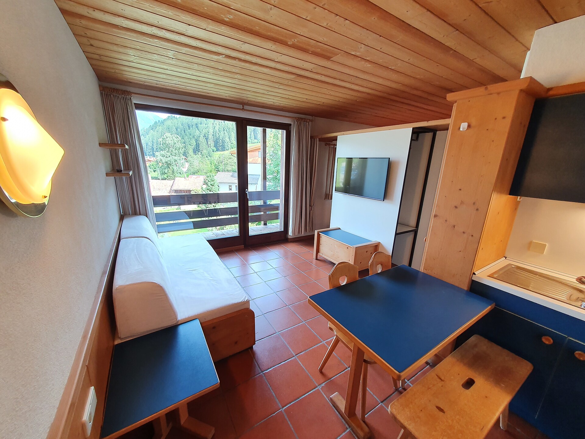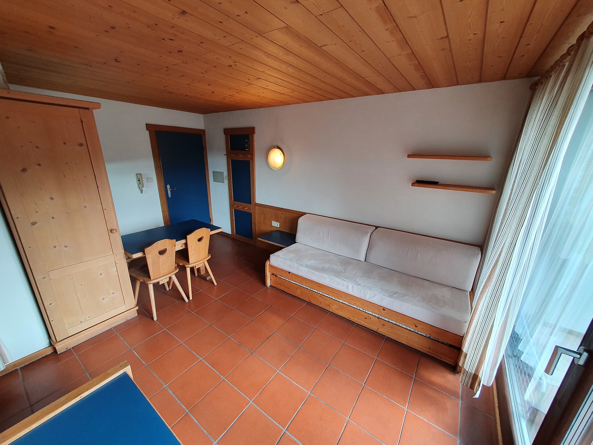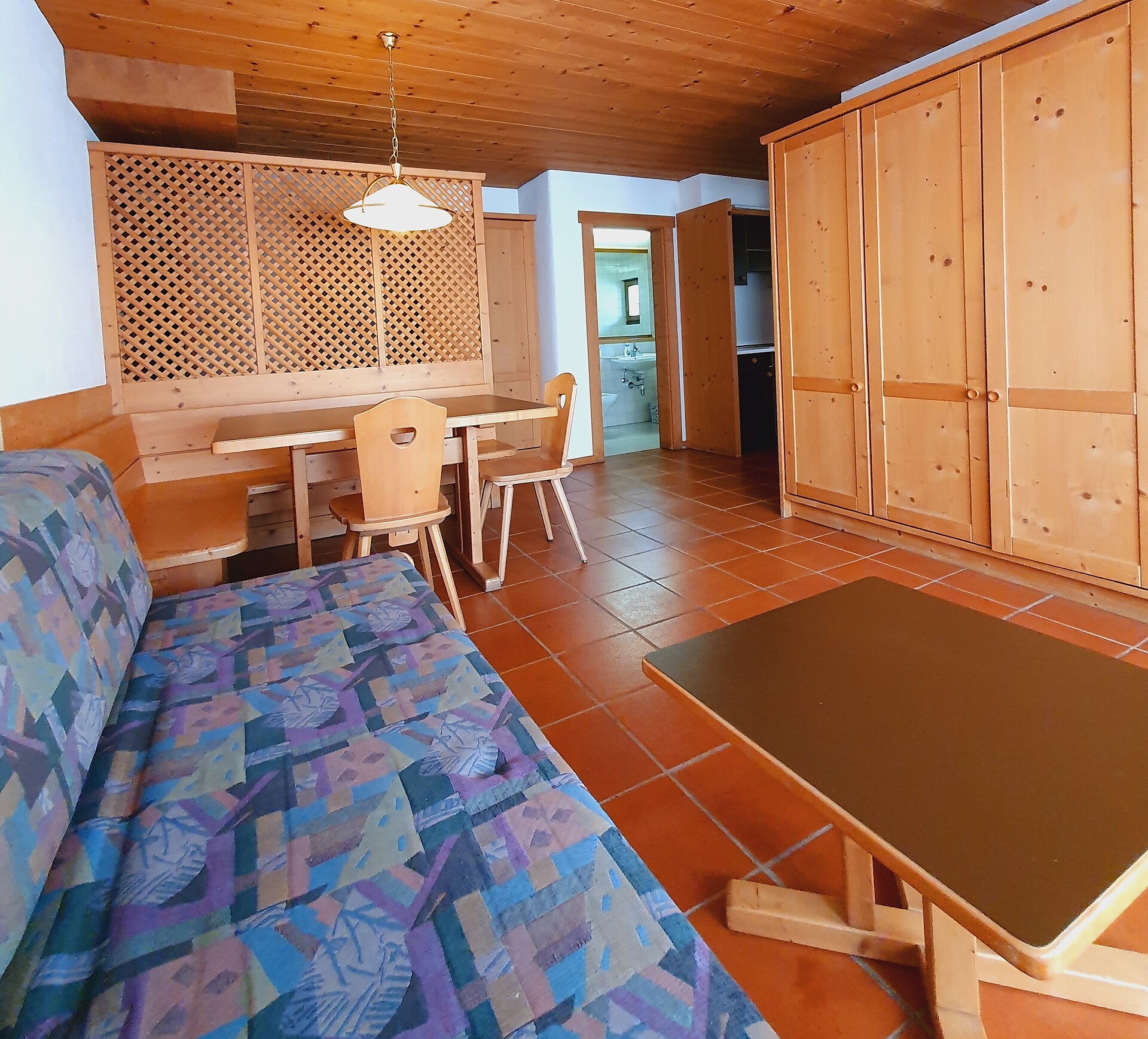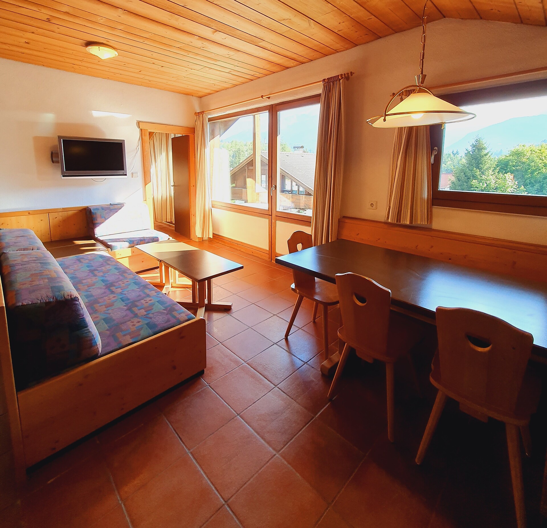 ideal for 3 adults: 2- room-apartment with balcony, 1 bedroom with double bed, pull-out sofa bed, TV and dining table in the living area, kitchenette; bathroom with bathtub and bidet. Towels and bed linen are included in the room rate; The flat is located on the first floor and is only accessible via the internal staircase.
