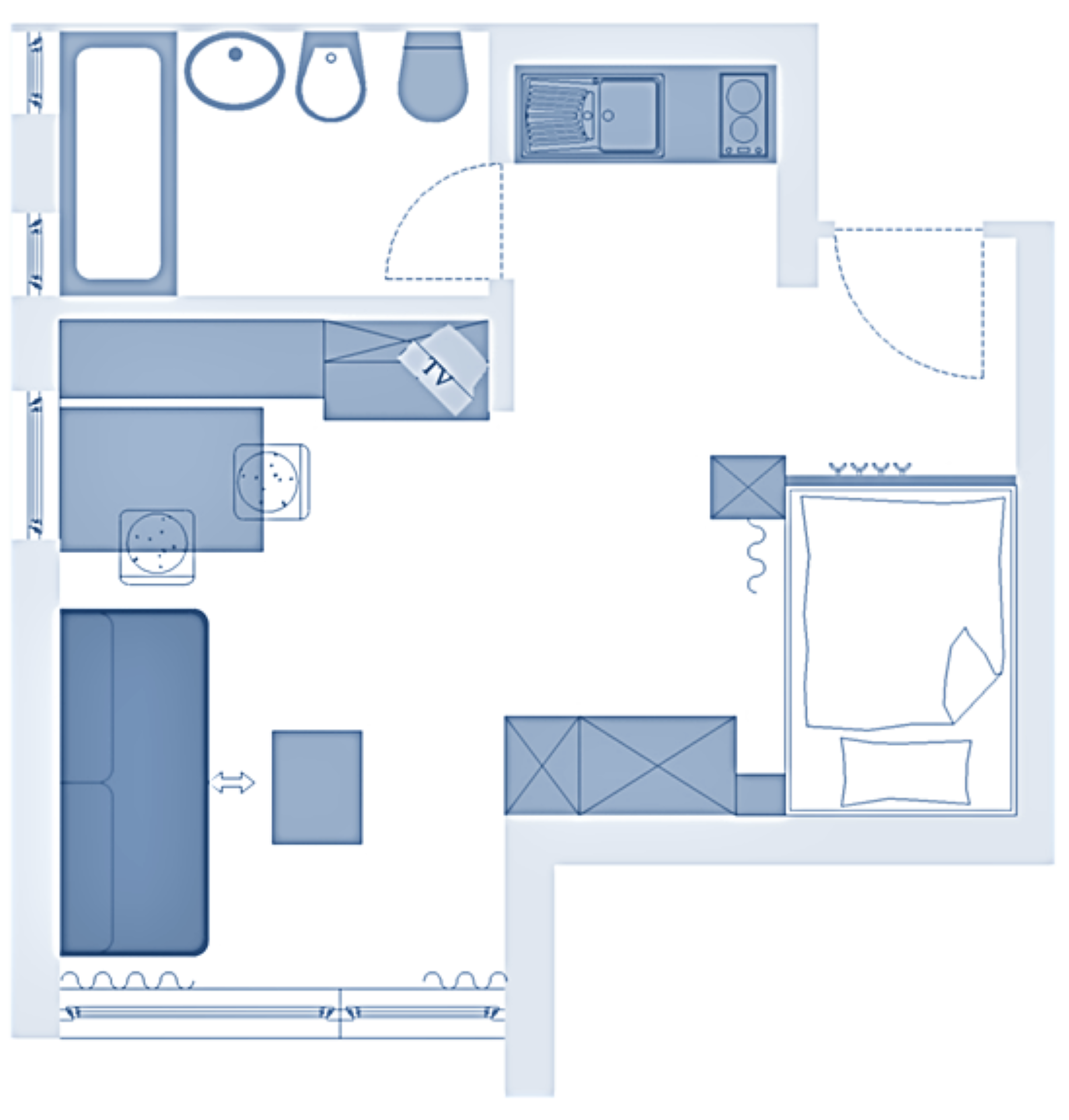 ideal for 2 people: studio with balcony or terrace, 1 double bed; couch, TV and dining table in the living area, kitchenette; bathroom with bathtub and bidet. Towels and bed linen are included in the room price;