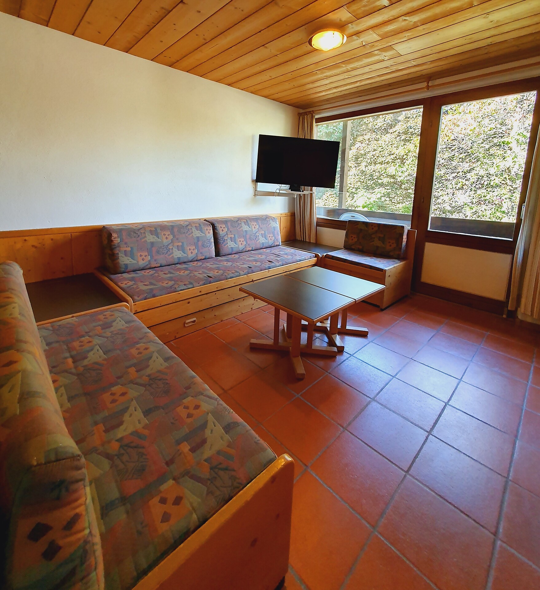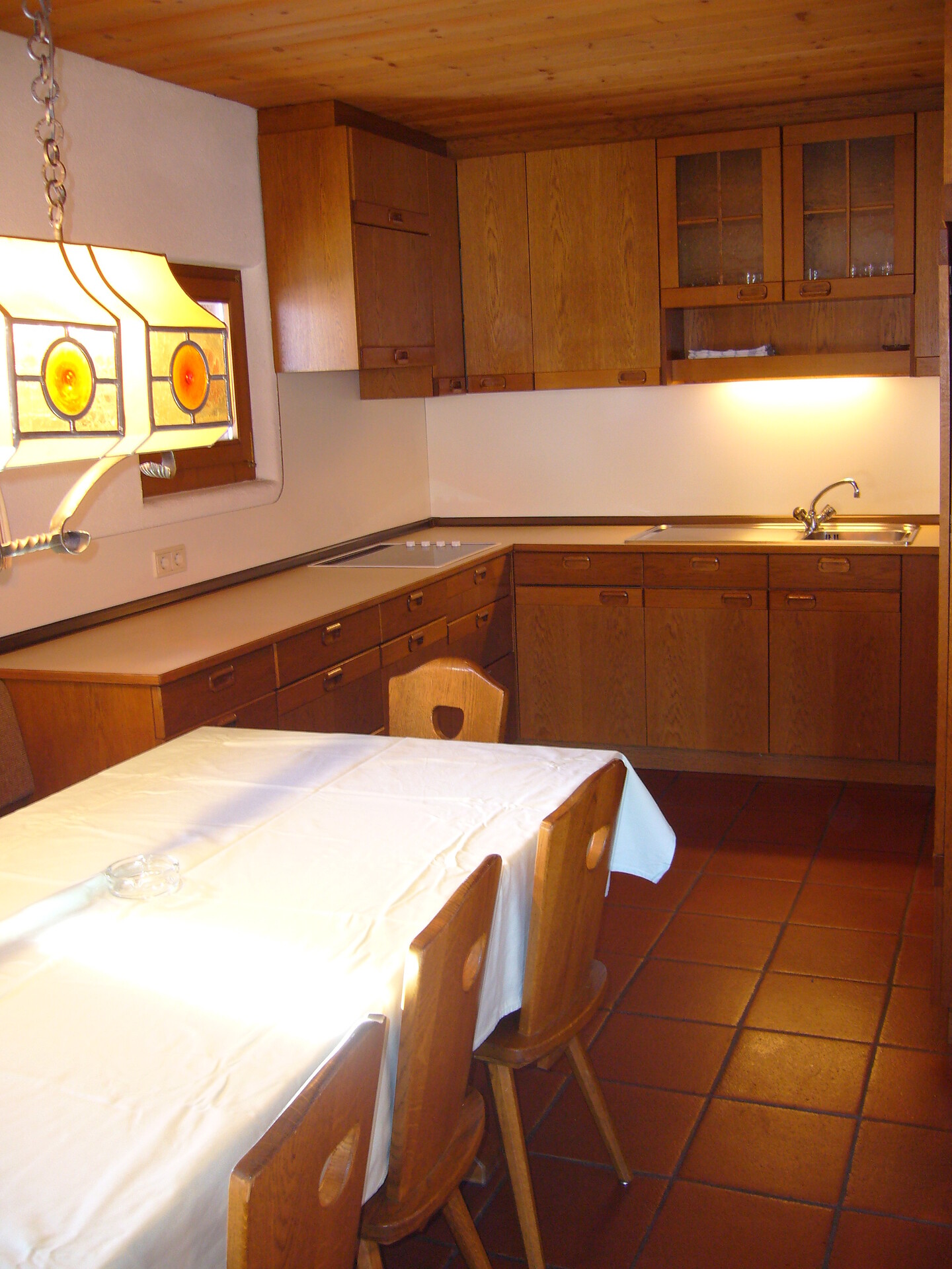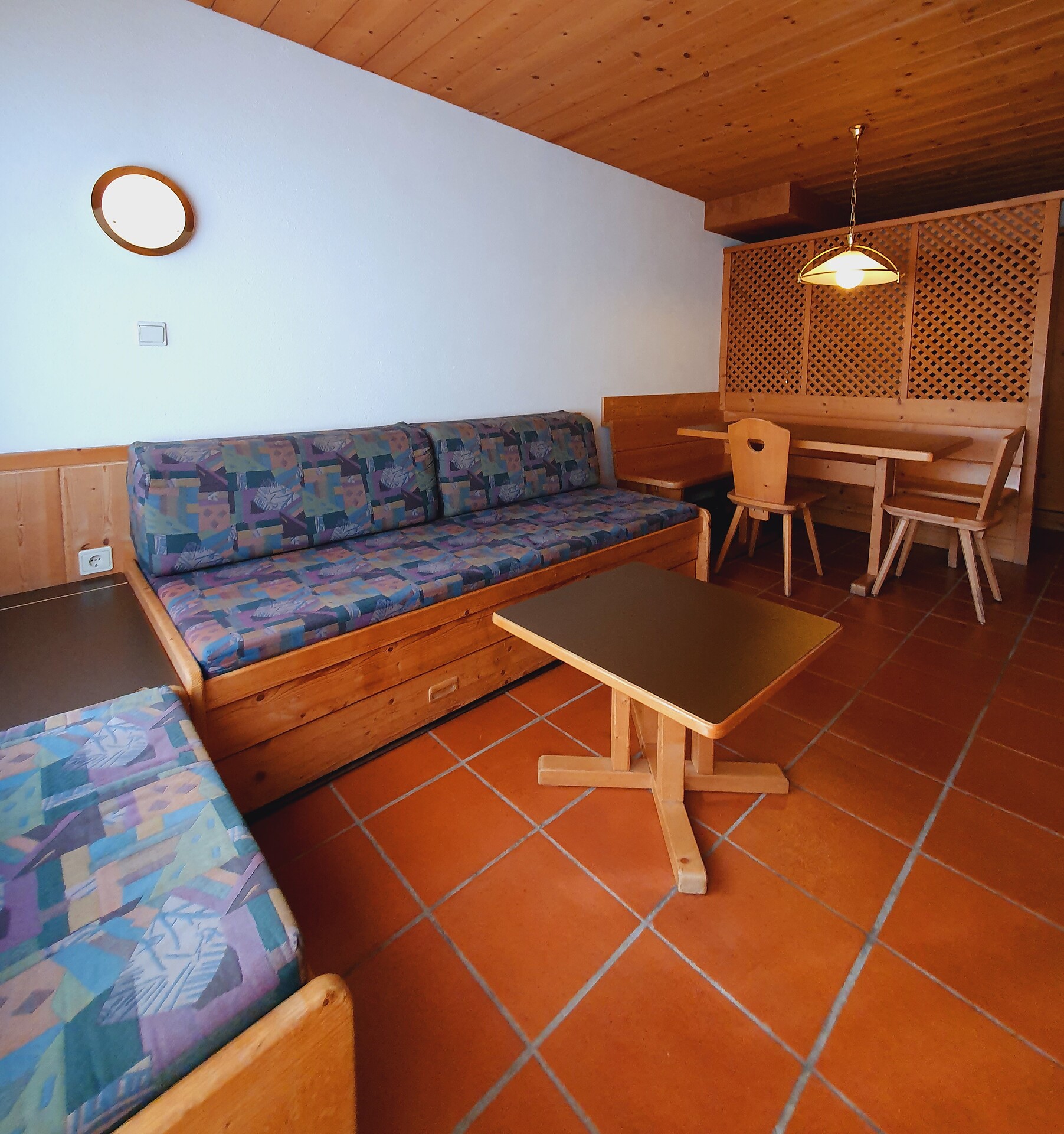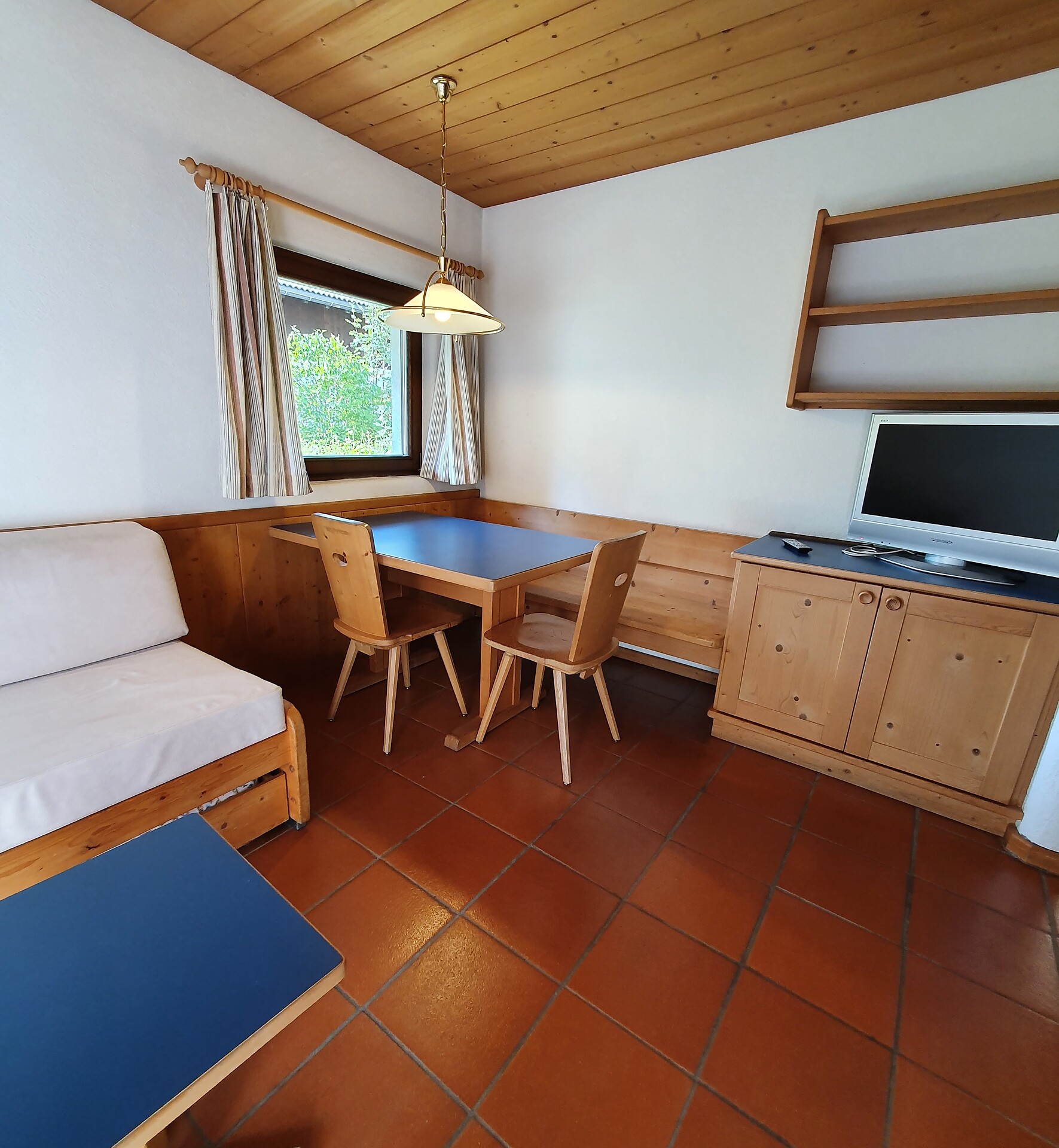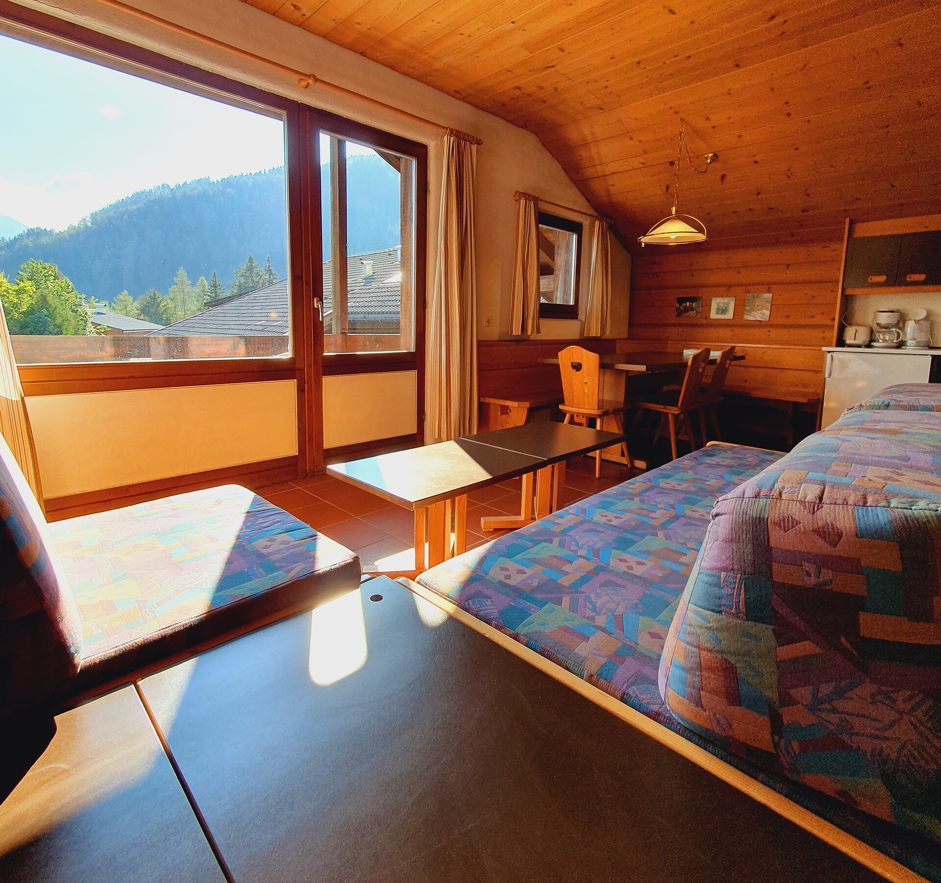 ideal for 2 adults and 3 small children: 2-room apartment with balcony, including 1 bedroom with double bed, pull-out sofa bed for max. 3 pers. in the living room; living area with TV and cosy dining area, kitchenette with coffee machine, kettle and toaster; bathroom with bath and bidet. Towels and bed linen are included in the room price; the flat is located on the first floor and is accessible only via the internal staircase.
