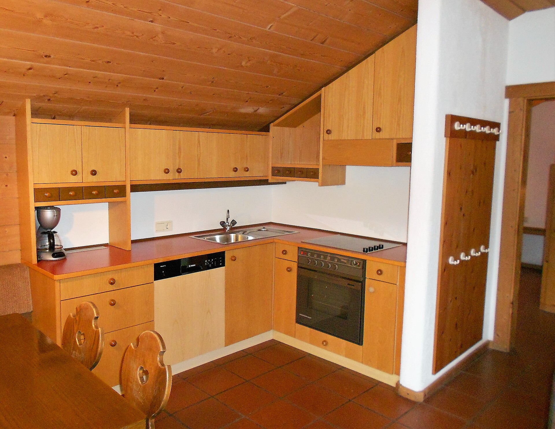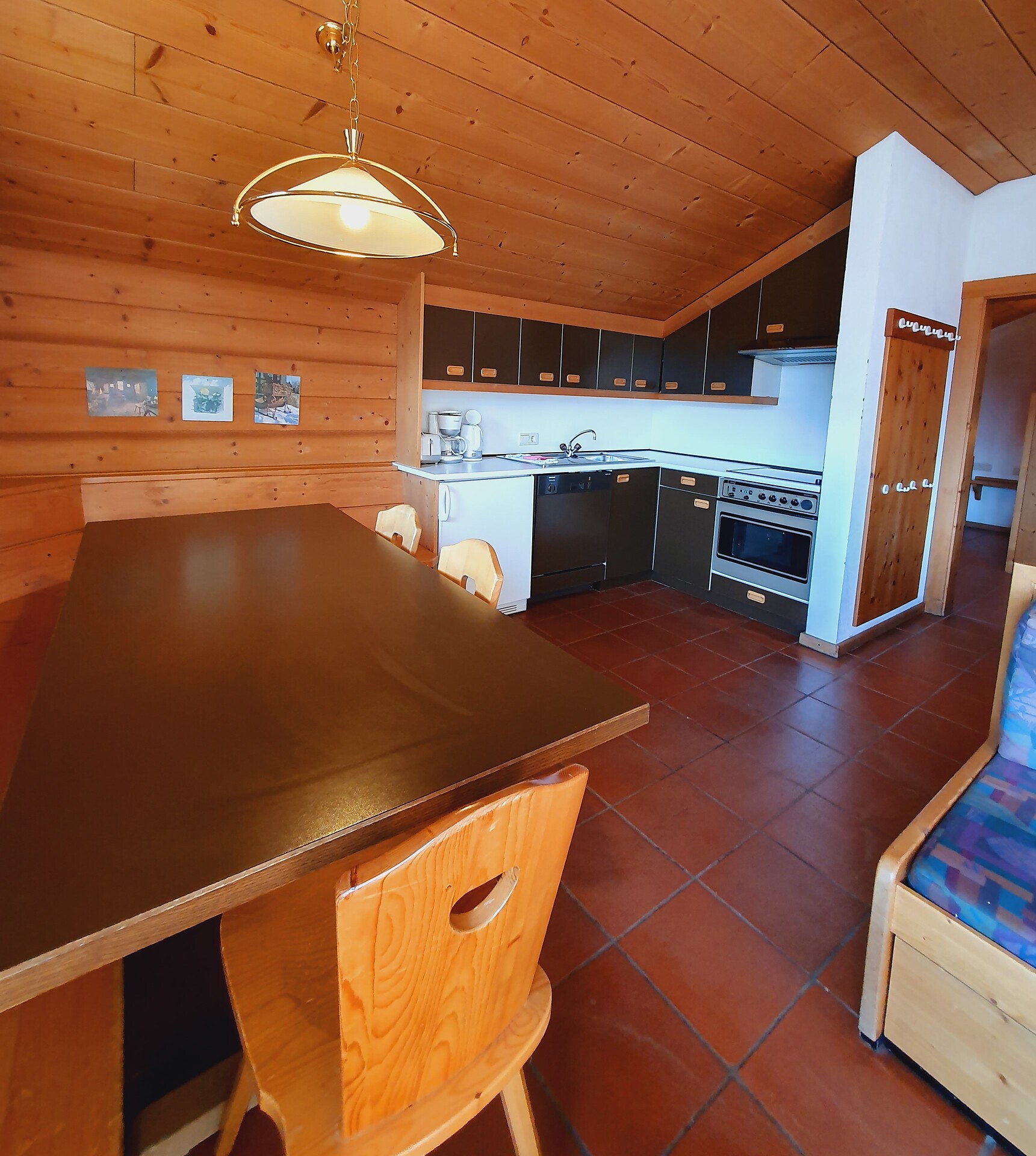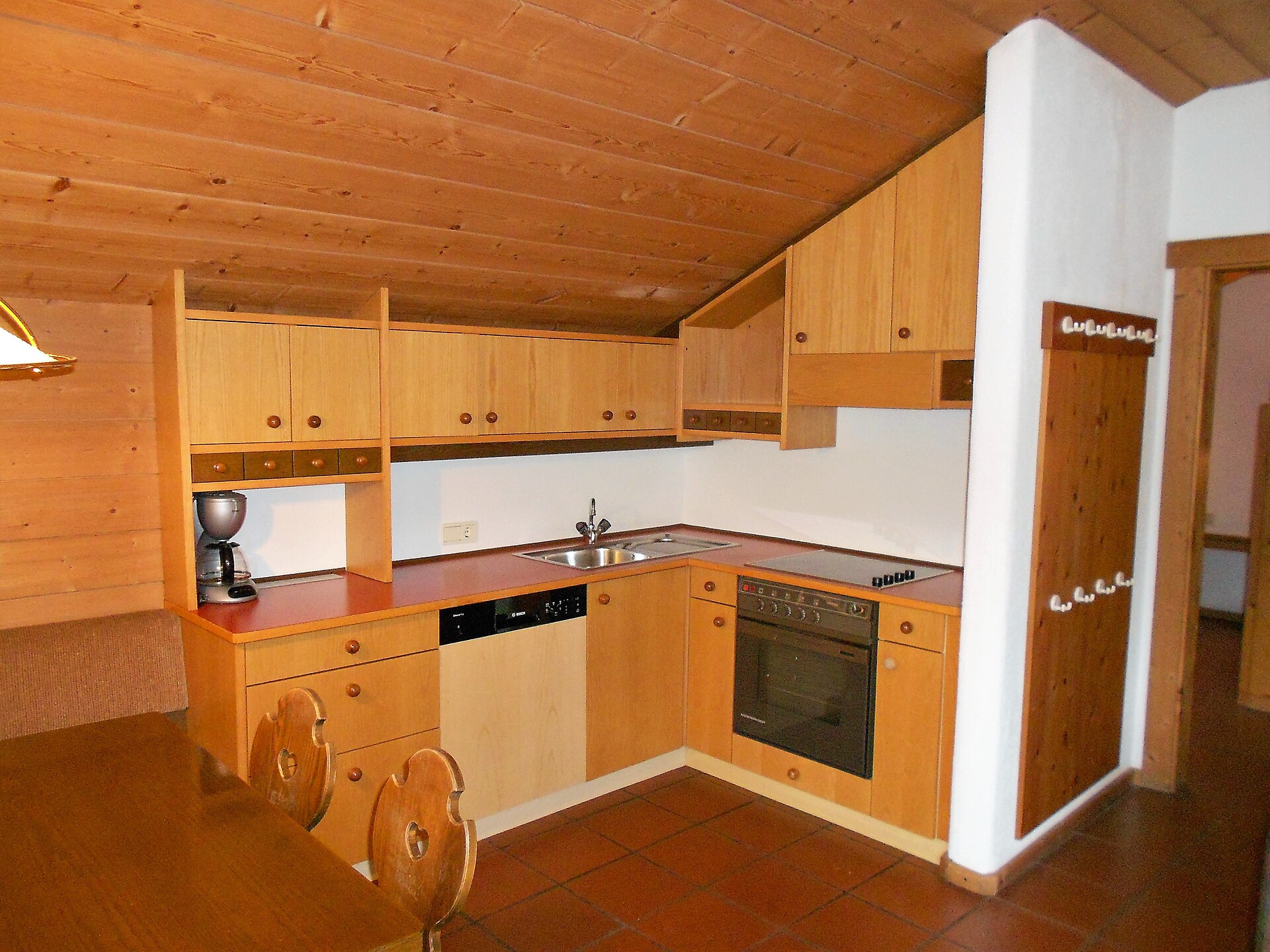 4-room apartment with balcony, 2 bedrooms with 1 double bed each, 1 bedroom with two bunk beds (for 4 pers.), pull-out sofa bed for 3 pers. and TV in the living area, kitchenette with large dining area, dishwasher and oven; bathroom with bathtub and bidet, additional separate WC; towels and bed linen are included in the room price; The apartment is located on the 2nd floor and is only accessible via the interior staircase.