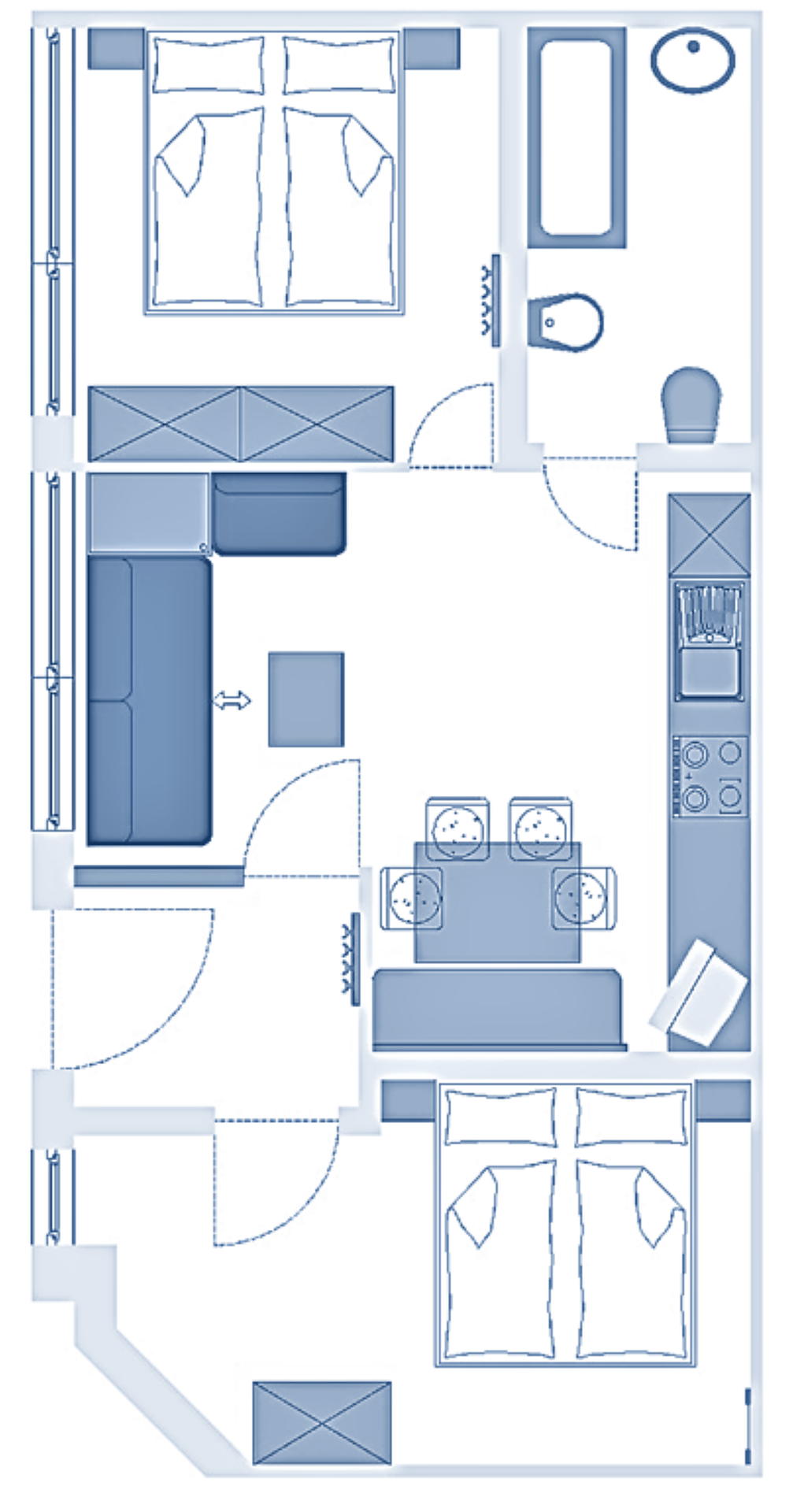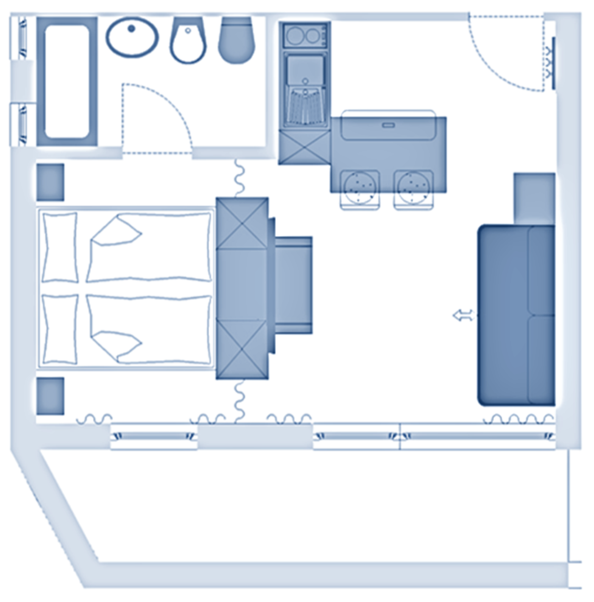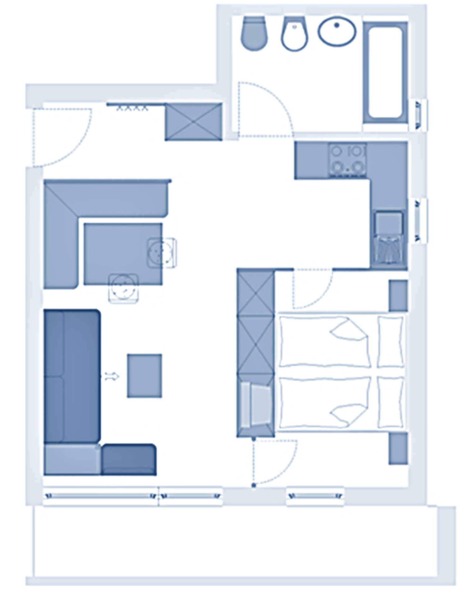 ideal for 2 adults + 2 small children: 1 studio with balcony or terrace, 1 double bed; pull-out sofa bed, TV and dining table in the living area, kitchenette; bathroom with bathtub and bidet. Towels and bed linen are included in the room price;